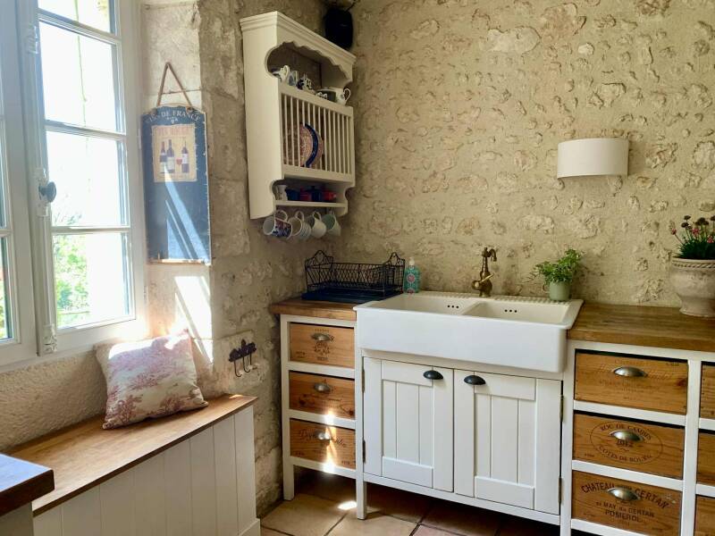 The kitchen is definitely the heart of our home. Again, some exposed stone walls, exposed beams and a large Charentaise fireplace with wood burning stove. Hardwood double-glazed windows and cosy window seat, double sink unit, tiled floor. Two stone steps to: