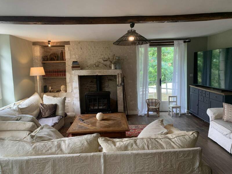 The light and welcoming sitting room (29m2) has double doors leading directly to the side-garden with a shady seating area under the silk tree. Walnut floor, exposed beam, exposed stone wall with oak shelving. Fibre-optic. Satellite TV. Beautiful stone fireplace with wood burning stove.